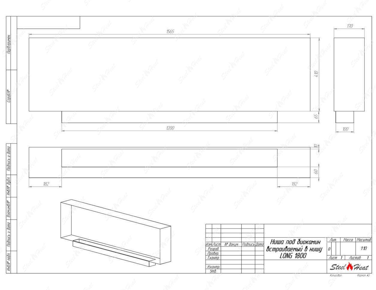 Встраиваемый Биокамин SteelHeat LONG 1800 предназначен для встраивания в глухие ниши из гипсокартона, кирпича, пеноблоков, бетона.