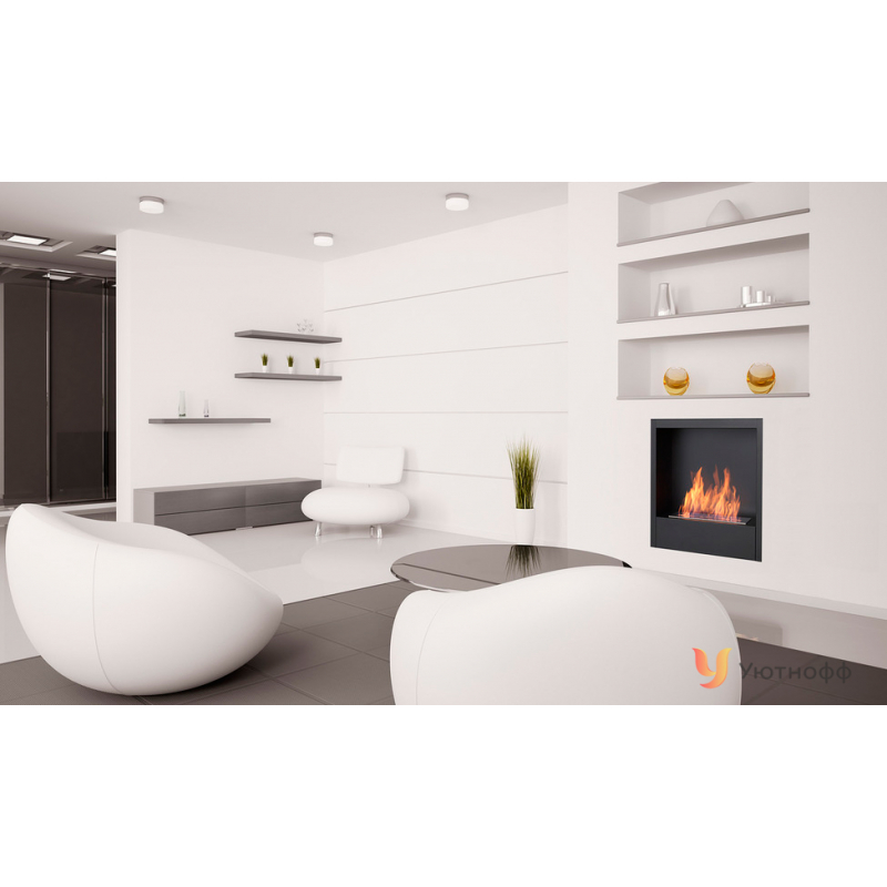 Очаг – это емкость куда заливается жидкое топливо. Емкость внутри заполняется керамическим материалом, который впитывает биотопливо, и в случае опрокидывания камина топливо не разливается. За счет этого конструкция стала полностью пожаробезопасной. Очаг встраивается в корпус из стали, который окрашивается специальной термостойкой краской, или же в заранее подготовленную нишу, изготовленную из негорючих материалов.