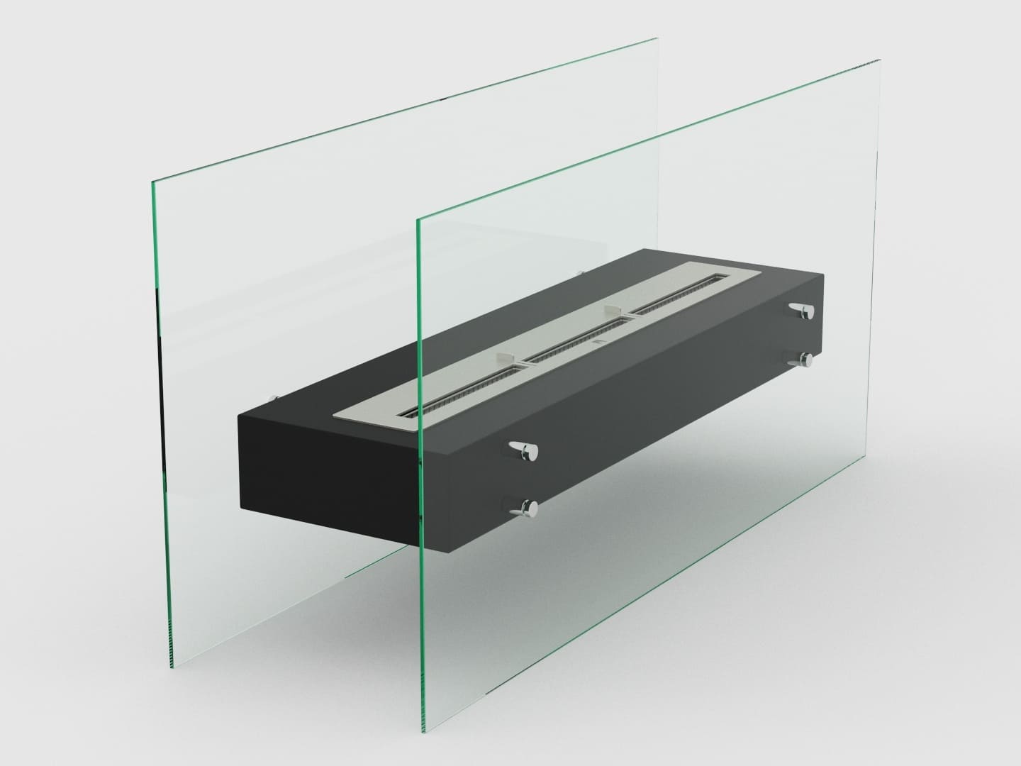 Представляет собой цельный металлический каркас с топливным блоком Lux Fire 900 М, закрепленный на 8 дистанционных держателях к защитным стеклам, создавая эффект «воздушности».