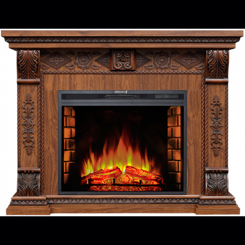 Классический массивный портал камина выполнен в цвете «дуб темный». Изысканности порталу придают украшенные резным орнаментом колоны и портик с орнаментом и рельефной резьбой.