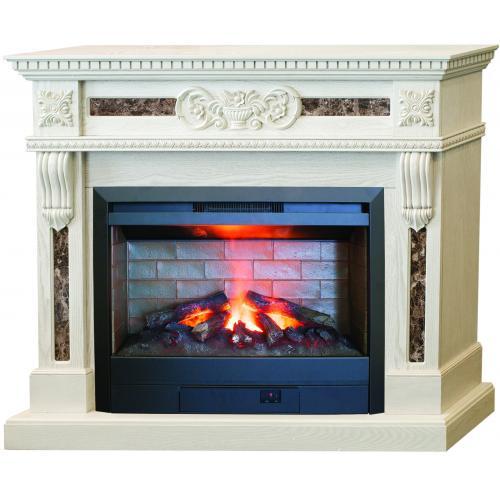 Портал каминокомплекта выполнен в классическом стиле и отличается сдержанным декором. Боковые панели оформлены в форме своеобразных прямоугольных колонн, верхняя часть которых резными изогнутыми консолями. Верхняя панель над очагом украшена изящным узором, центральным элементом которого является античная амфора. По бокам панели расположены квадратные вставки с розетками. На поверхности колонн и панели имеются вставки из цветного мрамора. Сверху портал венчает мощная каминная крышка, по кромке которой протянут геометрический узор. Устойчивость конструкции обеспечивает основание, на которое установлен портал.
