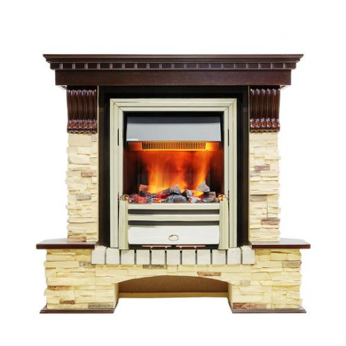 Портал выполнен в стиле кантри и максимально схож по дизайну с классическими каминами, которые можно было встретить в сельских жилищах 18 века. В его конструкции зона очага и основание четко разделены, образую букву Д. Очаг обрамлен стенками из камня, в верхней части которых установлены резные изогнутые консоли. Они используются для визуальной поддержки массивной каминной крышки. Основание имеет арочную конструкцию, а пространство под сводом при желании можно оформить настоящими или декоративными Муляж дровми. По бокам от очага основание оформлено небольшими полочками, а предтопочное пространство выложено камнем.Очаг комплекта имеет классическую конструкцию. Благодаря выступающей нижней части он имеет небольшую глубину встраивания, что и позволило вставить его в портал небольшой глубины. В выступающую корзинку вставлен механизм формирования пламени, который закрыт сверху керамическим муляжом дров и углей. Особенностью этой модели очага является наличие встроенной независимой подсветки дров, которая создает дополнительный эффект мерцания. Внутренние стенки оформлены таким образом, чтобы эффектно подчеркнуть красоту огня.