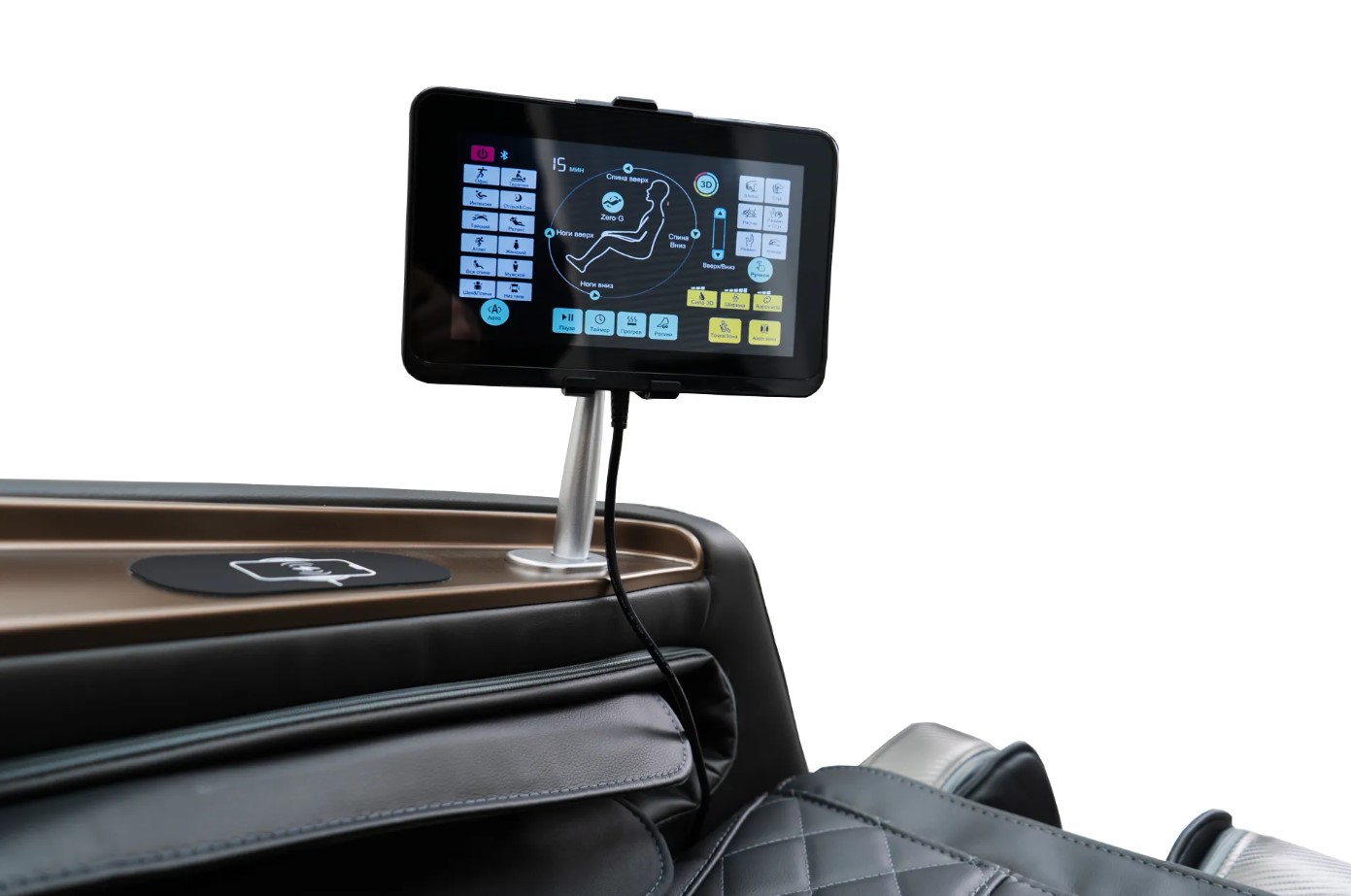 В подлокотник кресла встроена панель беспроводной зарядки смартфона - чтобы от массажа не отвлекали даже такие мелочи, как низкий заряд.