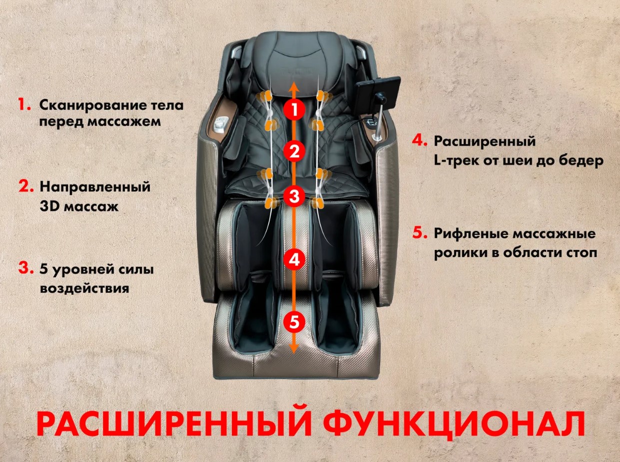 Запоминание программ - при ручной настройке массажных функций, их можно сохранить в компьютере кресла., Музыка - подключение к креслу по Bluetoth для прослушивания Вашей любой музыки во время массажа., Невесомость (Zero-G) - кресло принимает положение, при котором ноги находятся выше уровня головы. При таком положении происходит максимальное расслабление и прорабатывание более глубоких тканей роликовым массажем., Прогревание - с помощью инфракрасного прогрева происходит расслабление мышечных тканей, за счёт чего массаж становится ещё более эффективен., Регулировка под рост - с помощью этой функции кресло подойдёт людям с разным ростом., Слайдер - благодаря данной функции устройство можно ставить практически вплотную к стене и не беспокоиться, что при начале массажа, спинка кресла упрётся в стенку., Вытягивание позвоночника- это автоматическая программа, во время которой кресло складывается, массажные подушки бережно захватывают голеностоп, плечи и руки, кресло выполняет потягивающие движения, при этом совершая роликовый массаж вдоль позвоночника., Сканирование - перед началом сеанса, кресло выявляет отличительные особенности пользователя и проблемные зоны. |