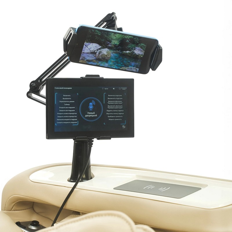 - Беспроводная зарядка — встроена в подлокотник;